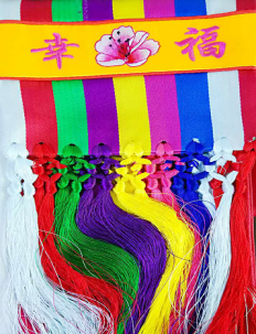 七彩巾:是根据朝鲜族崇尚七色的民间习俗制作的一种社交礼仪信物,寓意为幸福、美好。七彩巾以蓝、白、红、绿、橙、黄为主要颜色,质地高雅、色彩明快。