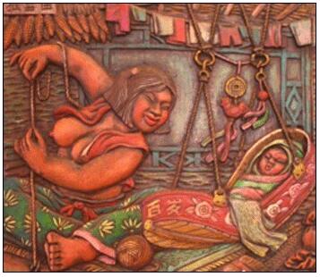 其实,把孩子放在一个长的两头椭圆或半圆形的俗名叫“悠车子”的东西里面,再把“悠车子”用细绳子悬挂在屋中的幔杆(夜晚睡觉时,用以悬挂隔开南北炕之间的布帘的长木杆)上面,来回像荡秋千一样悠动,主要目的是为了让孩子在“悠车子”中酣睡时,大人在炕上、屋内干活或到近处的田间劳动。