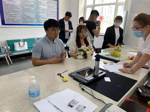 为了应对这个特殊的日子,和龙市民政局婚姻登记处提前制定了“5.20、5.21婚姻登记高峰应急预案”,及时增加结婚登记窗口,调配工作人员,取消午休,全体工作人员提前一个小时到岗,在登记大厅入口处安排专人进行防疫排查,引导当事人扫码、佩戴口罩安全有序进入,在工作人员的全力配合下大厅严格控制人数,一次允许进入4对新人,登记大厅每隔半个小时消毒一次,全天开窗通风,领证后及时提示新人快速离开、不要逗留,确保登记工作有序开展。据统计,520、521两天办理结婚登记近80对,合格率100%,满意率100%。